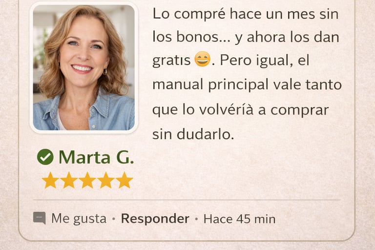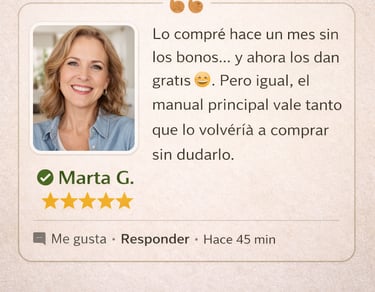 El manual está organizado por síntoma y problema de salud: dolor articular, insomnio, problemas digestivos, menopausia, presión alta, azúcar elevada, ansiedad y muchos más. Son enfoques naturales complementarios que miles de personas ya utilizan con éxitos comprobados.