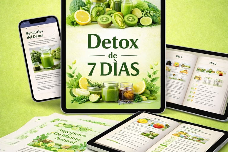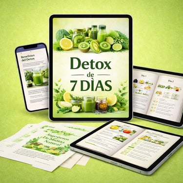 Detox de 7 Días es una guía práctica diseñada para ayudarte a limpiar tu organismo de forma natural, mejorar tu energía y recuperar el equilibrio en solo una semana con hábitos simples y efectivos.